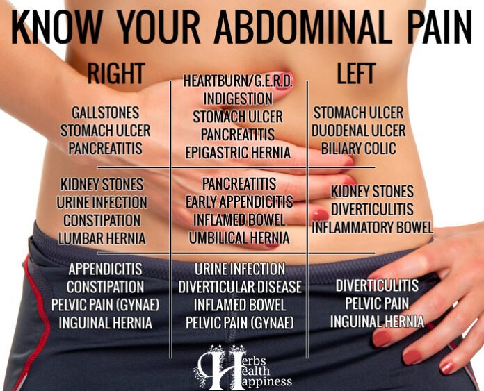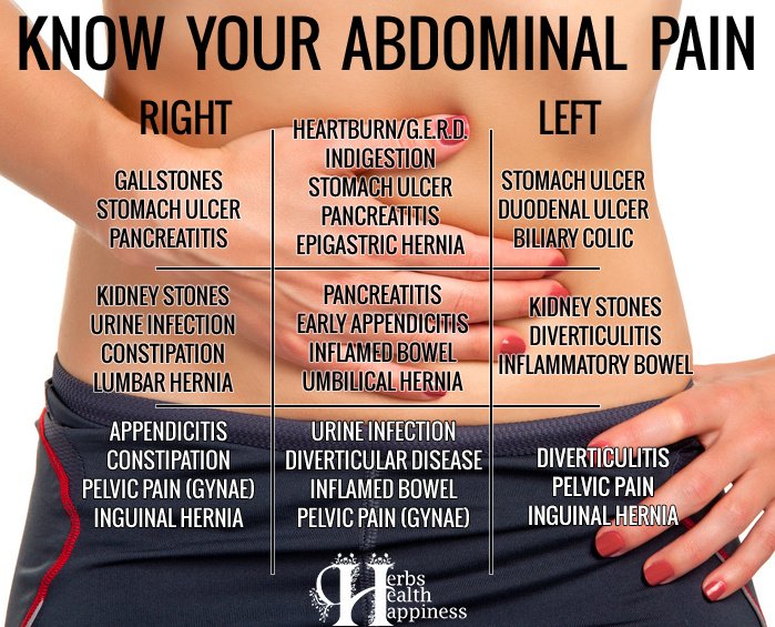 Although there is often “overlap” between the areas of the abdomen that may be in pain due to a particular cause, this general chart may be of value in a preliminary assessment. However, we do stress that (as with the rest of this website) this is not medical advice, and that appropriate professional medical care should be sought, especially in cases of greater severity.